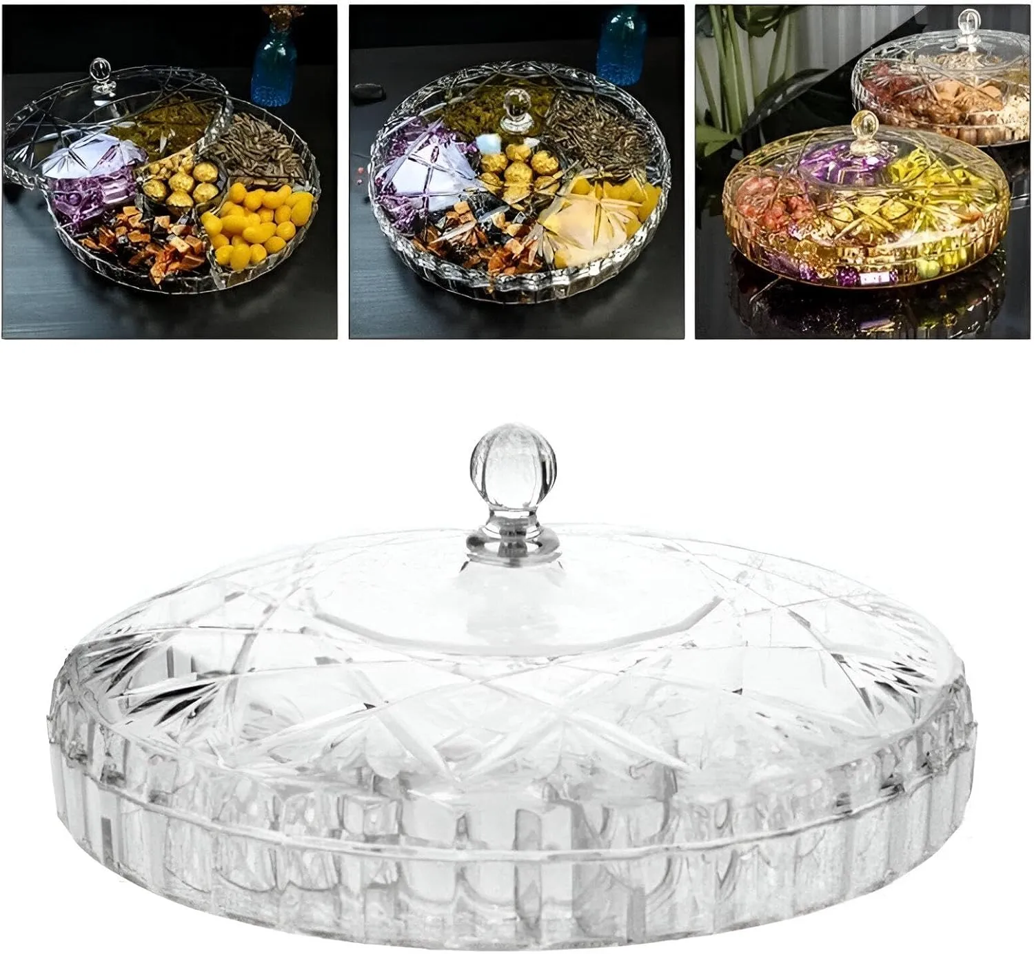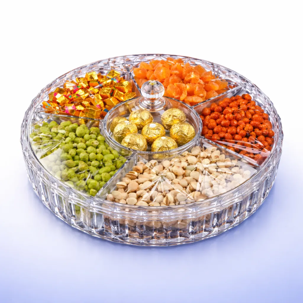 طبق تسالي أكريليك مقسم 6 خانات بقطر 31 سم – منظم مكسرات وحلويات كريستالي بالغطاء