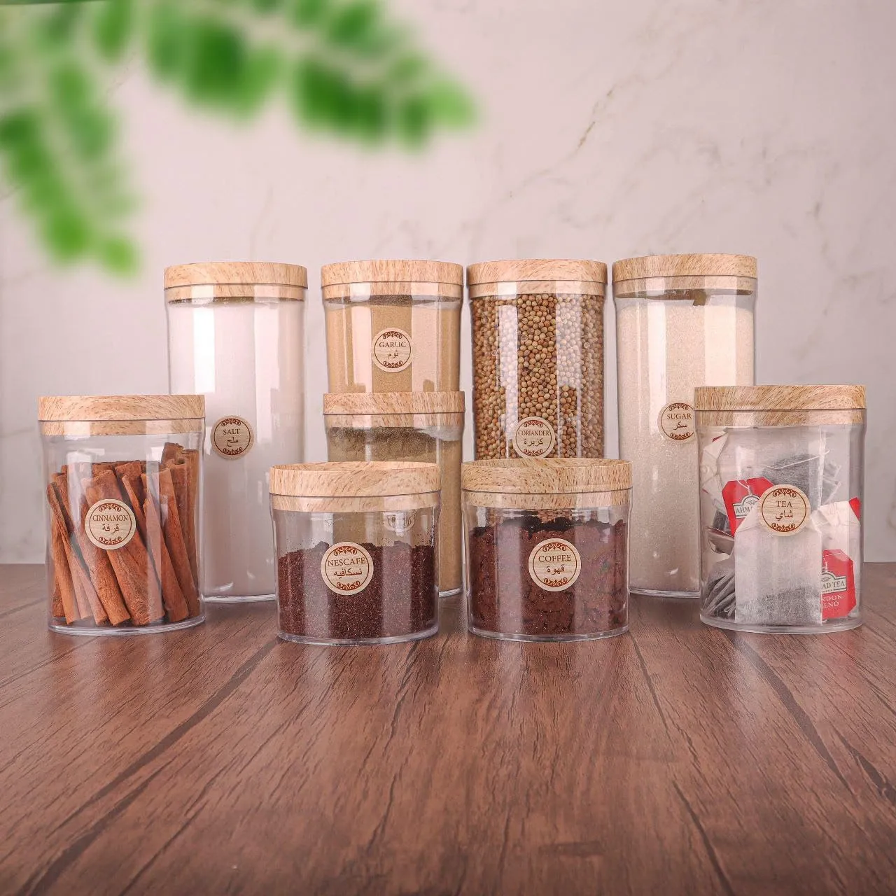 طقم توابل وبقوليات توليب 9 قطع أكرليك شفاف – منظم مطبخ عصري بأغطية خشبية وستيكرز أسماء