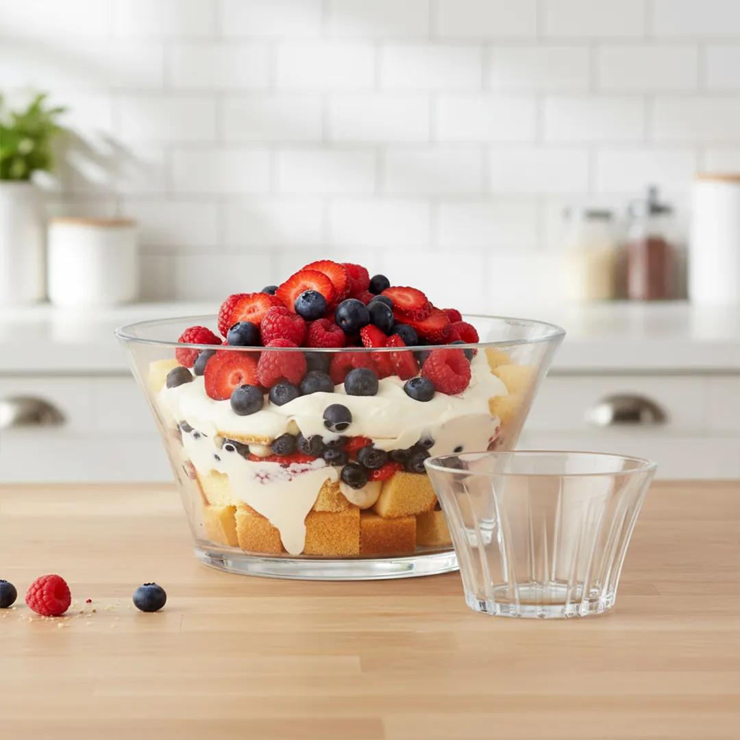 يتميز طقم خشاف لنس بتصميم مدروس بعناية؛ حيث تكون السلطانية الكبيرة والبولات الصغيرة شفافة تماماً في الجزء العلوي لتسمح لضيوفك بمشاهدة تدرجات ألوان الفواكه، المكسرات، أو الحلويات بداخلها بوضوح تام. أما الجزء السفلي، فيتزين بخطوط طولية محفورة بدقة تعمل كعدسات تشتت الضوء وتخلق بريقاً ساحراً تحت إضاءة غرفة الطعام. هذه الخطوط ليست جمالية فقط، بل توفر “سيكولوجية الأمان” عند الإمساك بالبولات، حيث تمنع انزلاقها وتجعل مسكها مريحاً جداً لليد، مما يجعل تجربة التناول ممتعة وسلسة.تقنية الزجاج المقوى: سر لومينارك في القوة والمتانة