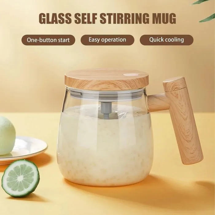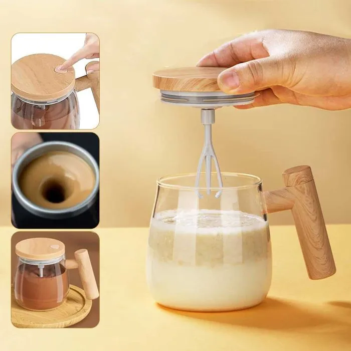 كوب خلط كهربائي زجاجي ذكي – مج ذاتي التحريك بمقبض خشبي وتخزين مغناطيسي