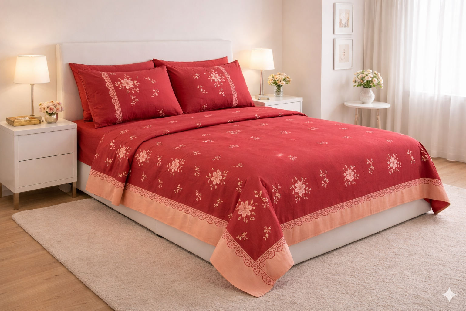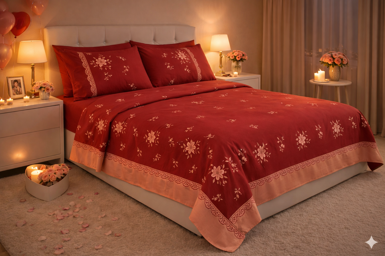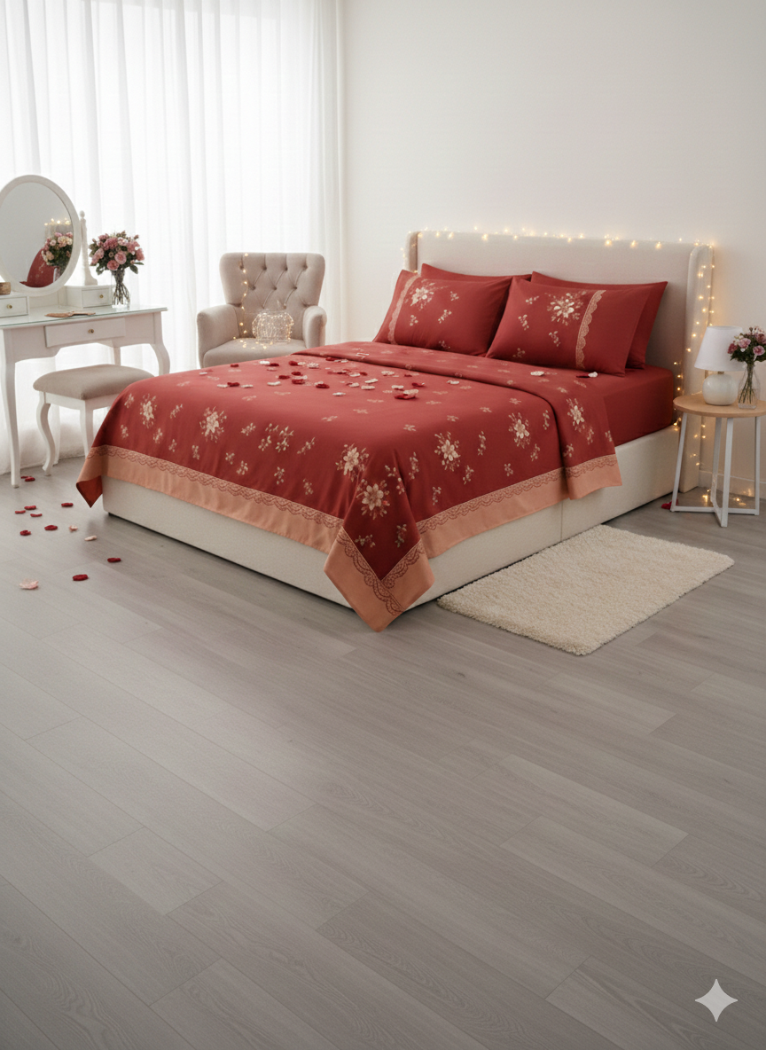يعتبر السرير هو القطعة المركزية في أي غرفة نوم، واختيار طقم سرير كبير ليس مجرد مسألة ديكور، بل هو استثمار في جودة نومك وراحتك النفسية. يأتي هذا الطقم باللون العنابي (البرغندي) ليضفي لمسة من الدفء والغموض الجذاب على غرفتك، مع دمج تطريزات نباتية رقيقة تعكس الذوق الرفيع.