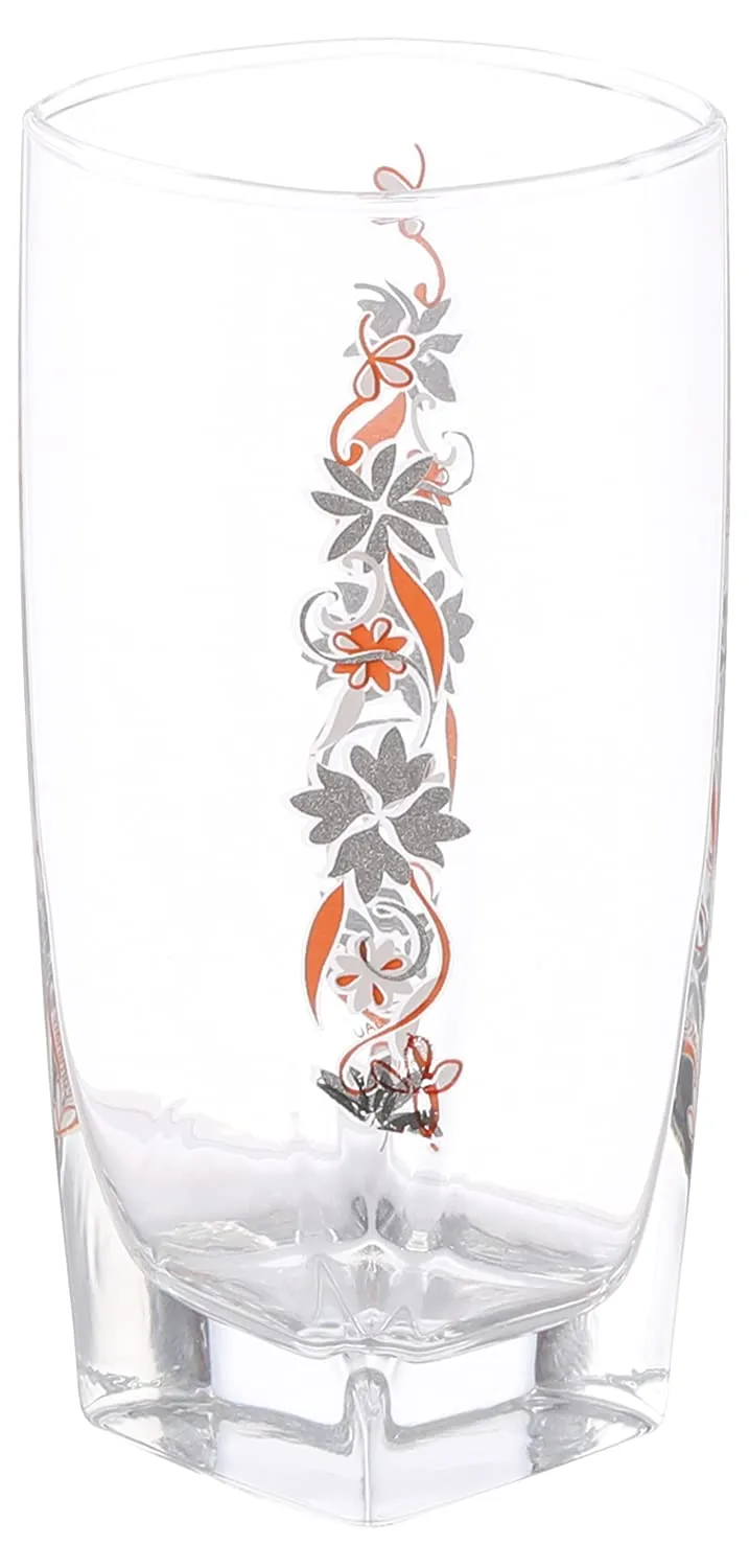 أما عن النقوش الزهرية، فقد تم اختيار الألوان بعناية فائقة؛ فاللون البرتقالي يمنح شعوراً بالحيوية والطاقة، بينما يعمل اللون الرمادي (الميتاليك) كعنصر توازن يضفي فخامة كلاسيكية. هذه النقوش ليست مجرد طبقة سطحية، بل هي مدمجة بتقنيات حديثة تجعلها تلمع تحت الضوء وتبرز نقاء الزجاج الشفاف، مما يجعل كل كوب يبدو كقطعة فنية فريدة.