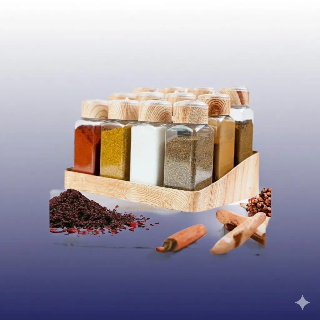 طقم توابل خشب 12 قطعة – منظم زجاجي فاخر بغطاء خشبي وحامل ديكور للمطبخ