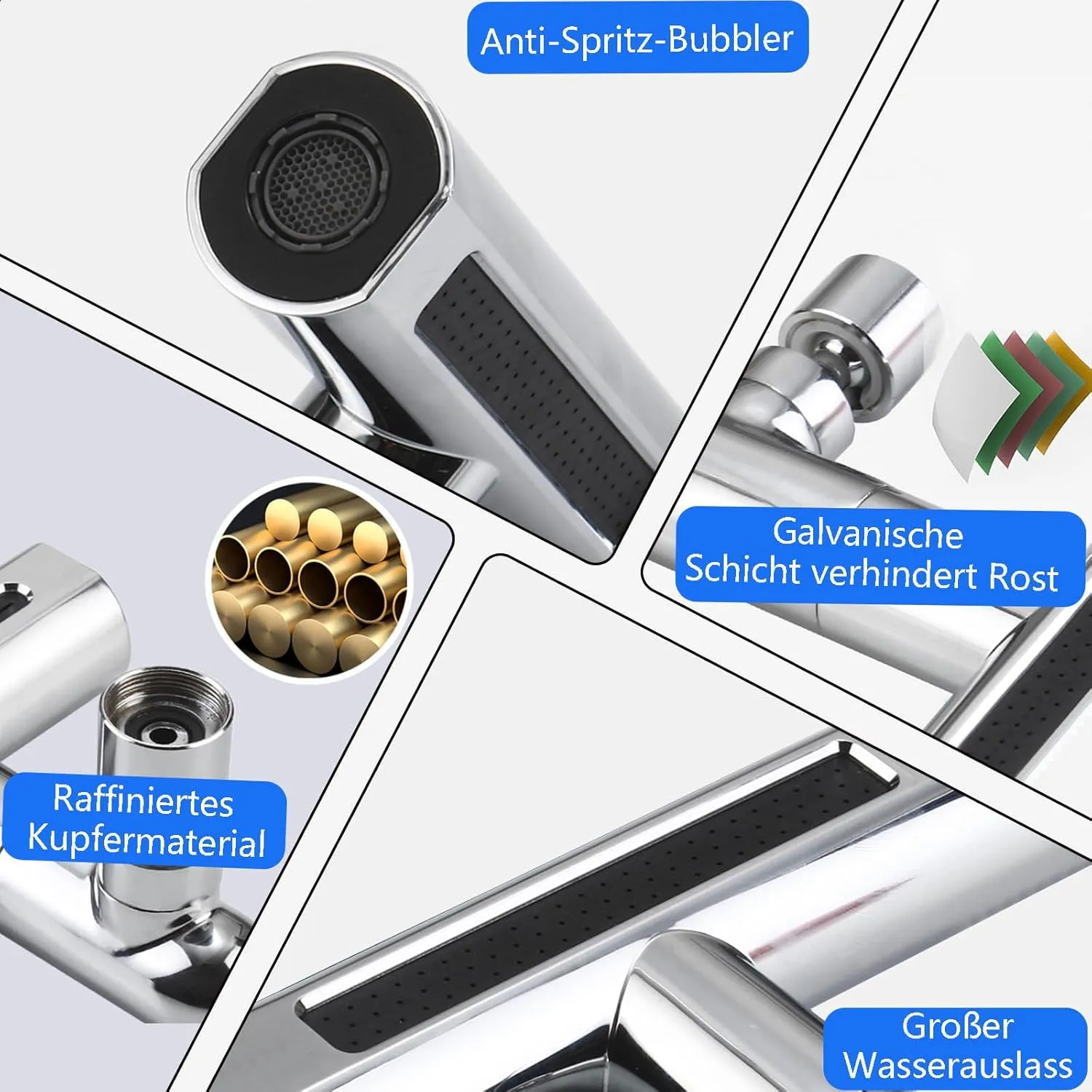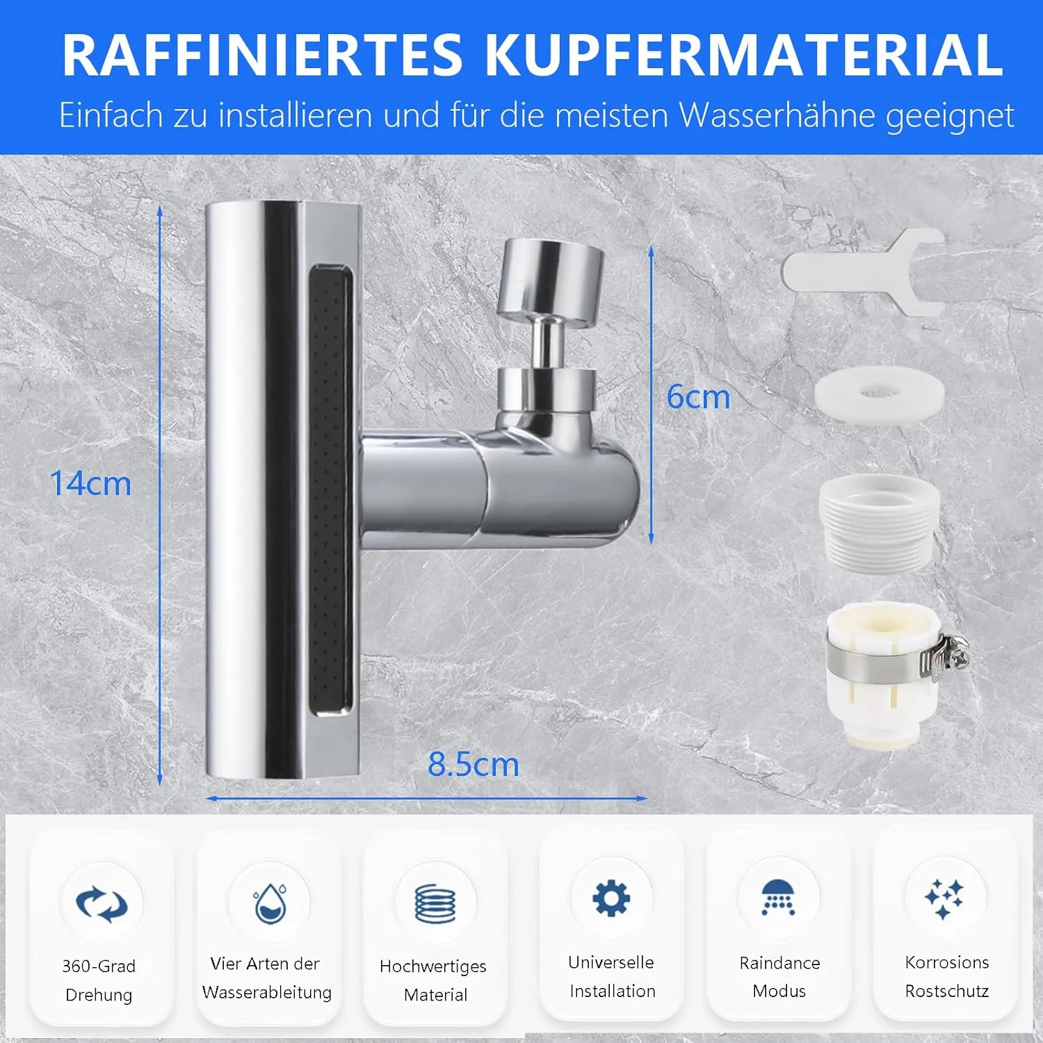 ارتقِ بتجربة مطبخك مع حنفية الشلال المتطورة. قطعة محول متعدد الوظائف مصنوعة من النحاس الصافي، تمنحك 4 وضعيات تدفق مياه (شلال، ضغط عالي، رذاذ، فقاعات). سهلة التركيب على أي خلاط حوض مطبخ أو خلاط حوض وش، وتوفر دوران 360 درجة لراحة قصوى وتوفير ذكي للمياه.